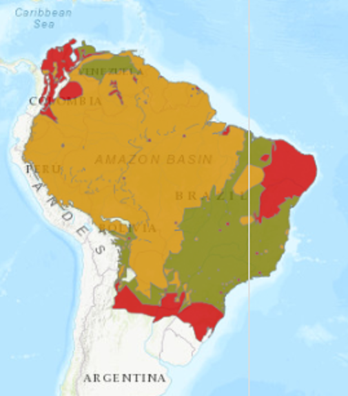 Habitat: Florestas tropicais de planícies e montanhosas, matas ciliares, pântanos, veredas, lagos e córregos.