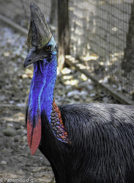 Características: A fêmea da espécie costuma ser maior que o macho, chega a medir cerca de 170 CM de comprimento e pesar 59 KG. Possuem cabeça e pescoço sem penas, na cor azul e vermelho negrito, o restante do seu corpo é coberto pelo preto ou por um marrom escuro.