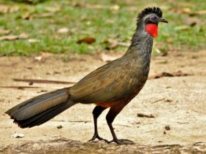 Características: Possuem aproximadamente 55 cm e 850 g. Sua barbela é nua e vermelha, mais notável e triangular nos machos. Apresentam topete rudimentar, asas com bordas ferrugíneas e olhos vermelhos, independente do sexo. Seu peito possui um desenho branquicento.