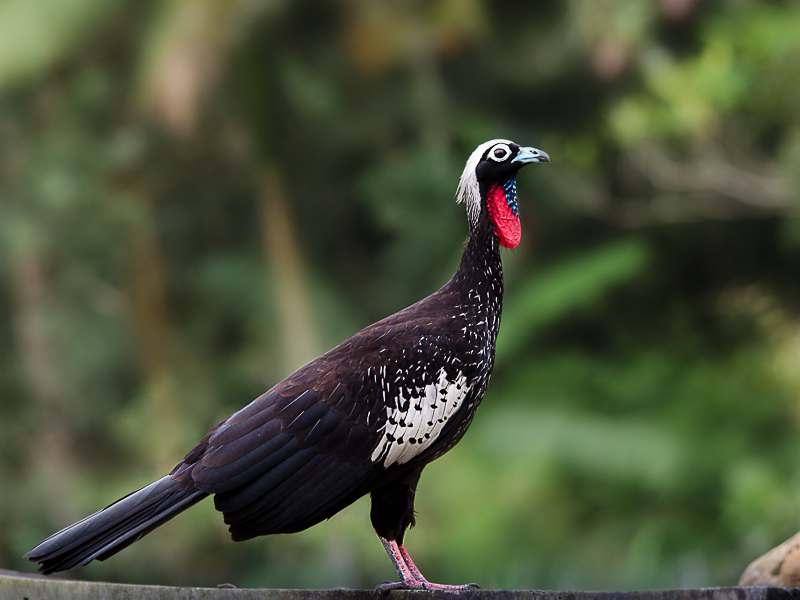 Características: A ave chega medir 74 cm de comprimento e pesar 1,4 quilogramas. Face negra e emplumada, sendo essa uma característica marcante da espécie em comparação com outras do mesmo gênero. Região perioftálmica branca, base do bico azul-esbranquiçada e barbela vermelha e azul. Destaca-se na mata a ave negra com o alto da cabeça e coberteiras das asas brancas.