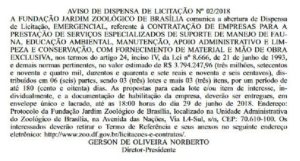 Dispensa de Licitação 02/2018 – Contratação contratação emergencial de empresas para prestação de serviços especializados de suporte de manejo de fauna, educação ambiental, manutenção, apoio administrativo, limpeza e conservação