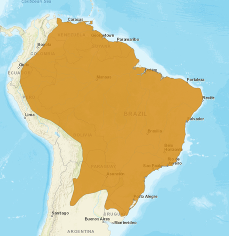 Distribuição Geográfica: Ocorre em todo o Brasil, sendo encontrado também na Colômbia, Venezuela, Guiana, Suriname, Guiana Francesa, Equador, Peru, Bolívia, Paraguai, Uruguai e Argentina.