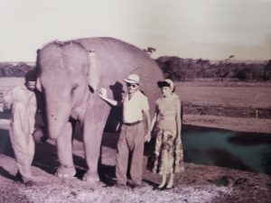 Gilberto com a esposa e um colega, ao lado da elefante Nely