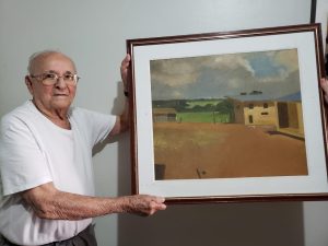 Gilberto segurando quadro que ganhou de presente de colega artista