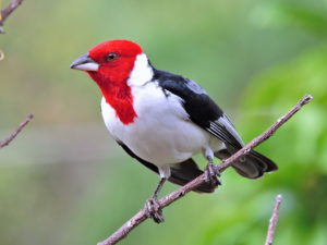 Características: Possuem aproximadamente 17.2 cm. A cabeça possui plumagem vermelha, curta e ereta. As partes superiores são cinzas, com exceção do dorso anterior, que é branco na base e negro no ápice. O dorso posterior e as penas coberteiras superiores das asas manchadas de preto. A maxila é negra e mandíbula cinza-claro.