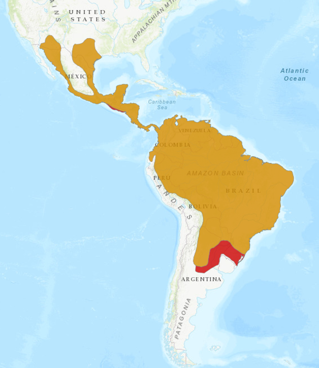 Distribuição Geográfica: Ocorre desde o Sul da América do Norte até a porção norte da Argentina, principalmente em áreas florestais, embora utilize também savanas e mangues.