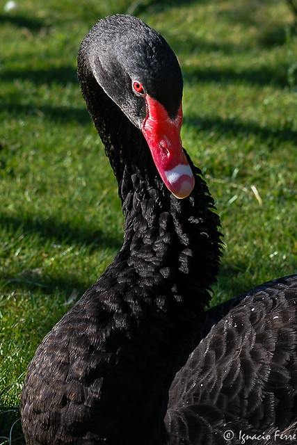 Características: Mede até 140 cm de comprimento na fase adulta e seu peso fica entre 8 e 9 quilos. Espécie possui uma cor preto uniforme com algumas manchas brancas e o bico vermelho.