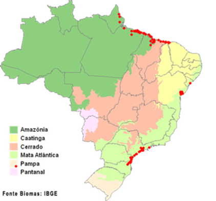 Distribuição Geográfica: Ocorrem no Brasil, no litoral das regiões Sul e Sudeste. Mundialmente há registros em países como Colômbia, Venezuela, Trinidad e Tobago.