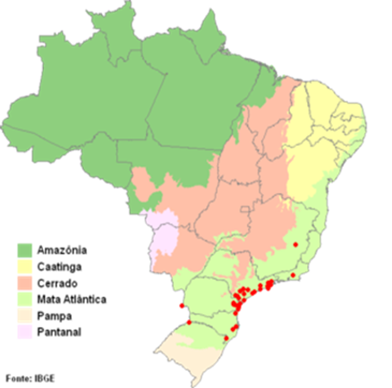 Distribuição Geográfica: Espécie que já foi extinta de vários locais de sua ocorrência original e que demanda um olhar criterioso. Ocorrem exclusivamente no Brasil e atualmente estão restritas a áreas protegidas de Mata Atlântica.