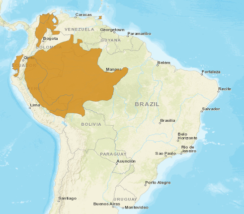 Distribuição Geográfica: Ocorre na Bolívia, Equador, Colômbia, Venezuela e Brasil, onde está distribuído por toda Amazônia ocidental, a oeste dos rios Negro e Branco, ao note e Tapajós, ao sul, nos estados do Pará, Roraima, Amazonas, Acre e Rondônia.