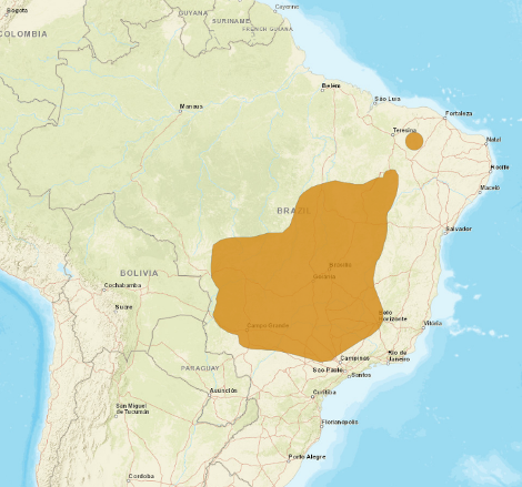 Distribuição Geográfica: Endêmica do Brasil, ocorre nos estados do Maranhão, Piauí, Tocantins, Rondônia, Mato Grosso, Mato Grosso do Sul, São Paulo, Minas Gerais, Bahia, Goiás e no Distrito Federal.